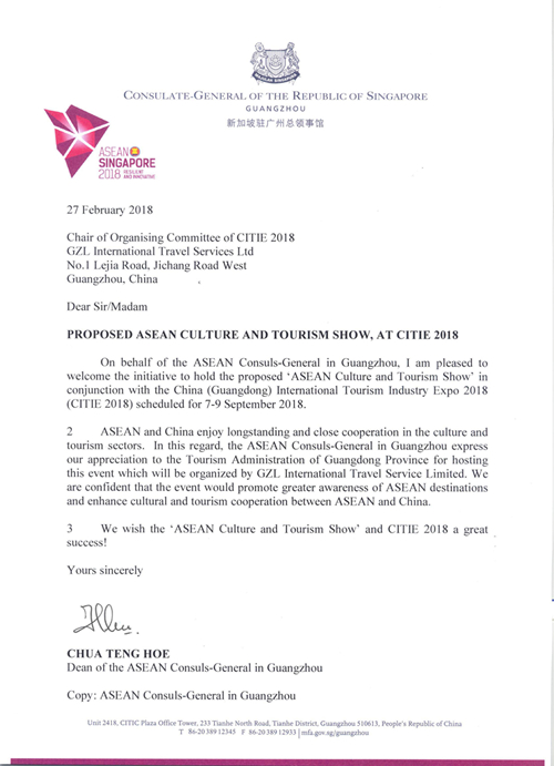 一直以來(lái),東盟駐穗總領(lǐng)事團(tuán)高度關(guān)注中國(guó)旅游市場(chǎng),大力支持成員國(guó)及企業(yè)到華南規(guī)模最大旅展廣東旅博會(huì)尋求中國(guó)合作伙伴,推廣東盟旅游。繼2017年,今年廣東旅博會(huì)組委會(huì)再次得到東盟駐穗總領(lǐng)事團(tuán)支持,獲駐穗總領(lǐng)事團(tuán)團(tuán)長(zhǎng)、新加坡駐穗總領(lǐng)事館總領(lǐng)事蔡簦合先生(Mr. Chua Teng Hoe)親自簽發(fā)支持信。總領(lǐng)事十分認(rèn)可旅博會(huì)在推廣東盟旅游中所作的貢獻(xiàn)。中國(guó)與東盟的文化交流源遠(yuǎn)流長(zhǎng),廣東旅博會(huì)東盟旅游展區(qū)將更好地推廣東盟成員國(guó)的旅游目的地,進(jìn)一步促進(jìn)東盟與中國(guó)之間的文化與旅游交往。